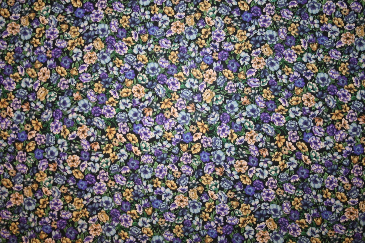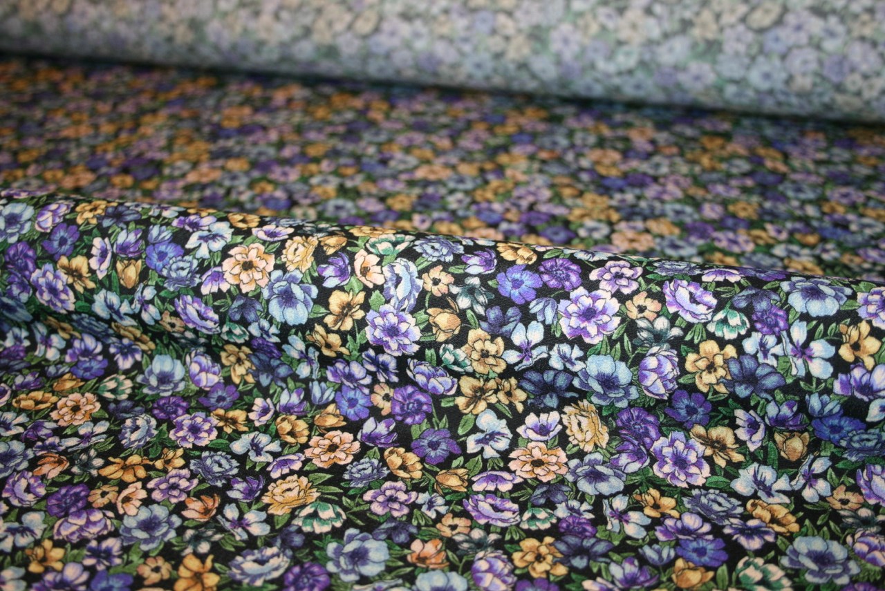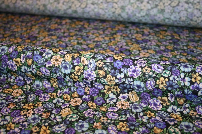 Fastvævet viscose crepe med små lilla og gule blomster på en sort bund. Kvaliteten er let og lækker.