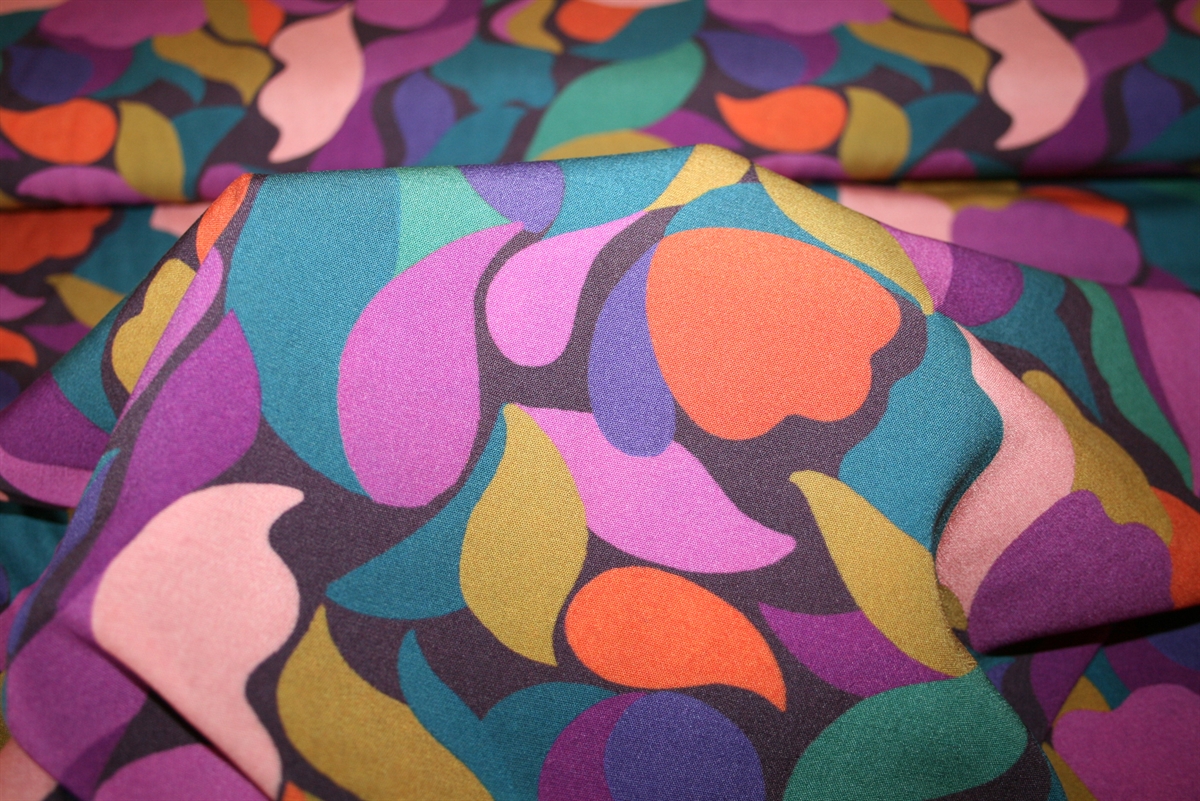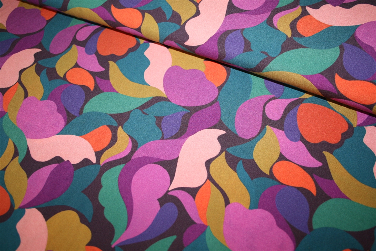 Blomstret viscose poplin med elastan. Kvaliteten er let og tungtfaldende. Stoffet er oeko-tex certificeret, dvs. uden skadelig kemi.