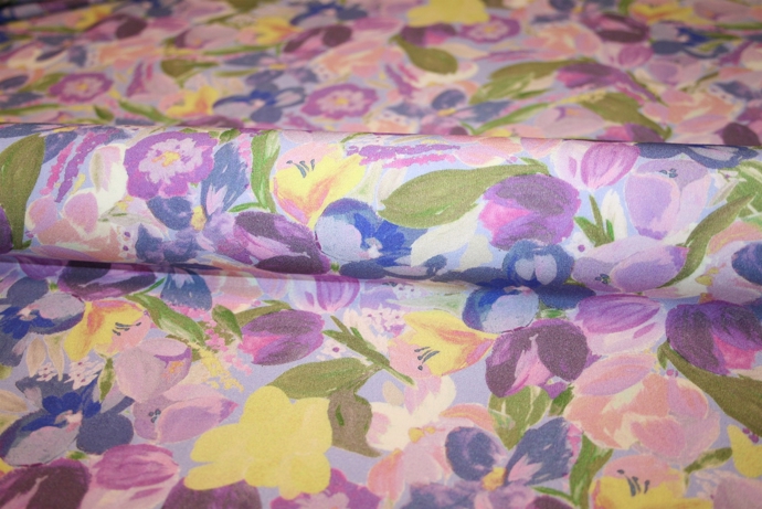 Fastvævet viscose i en let og blød italiensk kvalitet. På stoffet er et flot blomsterprint i sæsonaktuelle farver.