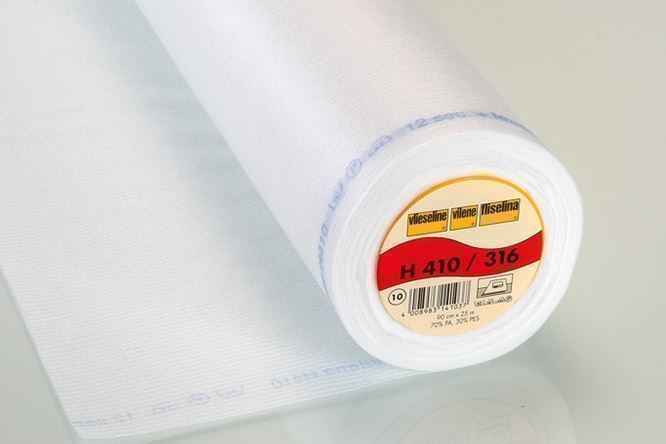Freudenberg hvid vlieseline H410 med trådforstærker i længderetningen. Strygeindlægget er anvendeligt til lidt kraftigere metervarer.