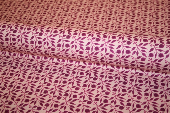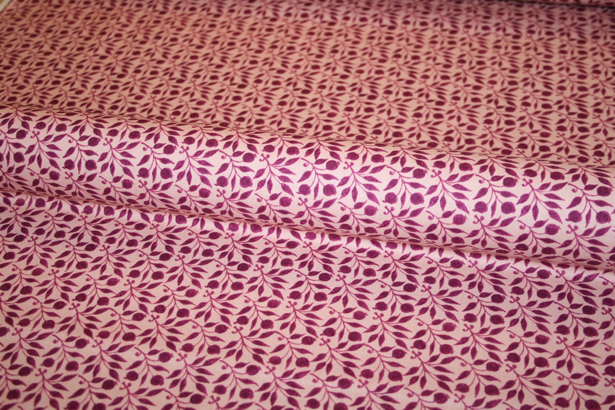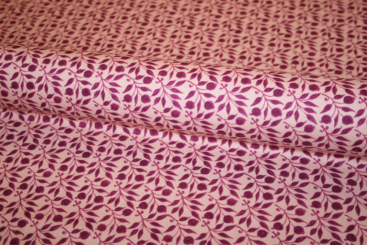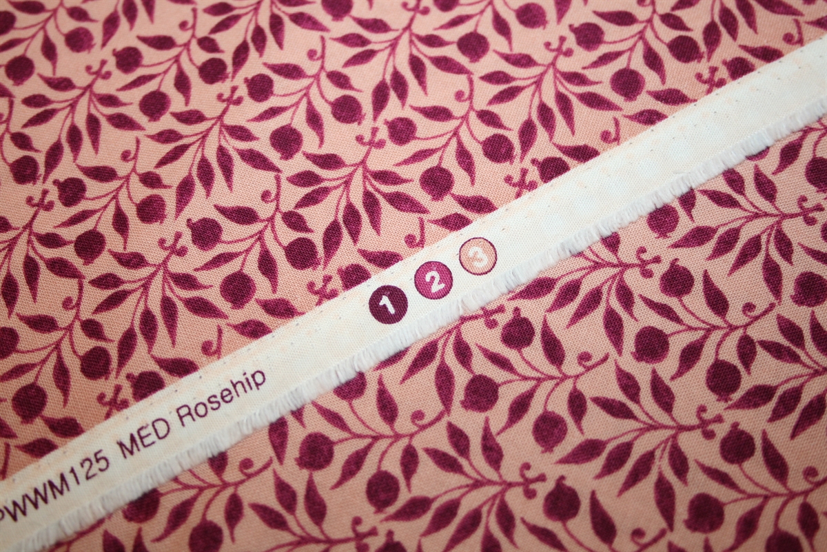 Rosehip er et elegant og stilrent William Morris-design, der hylder enkelhed og gentagelse. Mønstret består af små, fint tegnede hyben og blade, der gentages i et harmonisk rytmisk forløb. De dybe bærfarver står smukt mod den lyse baggrund og skaber et klassisk, men frisk udtryk. Det tætte, ensartede mønster giver stoffet en diskret livlighed, der fungerer både som hovedmotiv og som komplement til mere markante tekstiler. Farvepaletten består af en rosa bund og detaljer i dyb bordeaux, hvilket giver et varmt og sofistikeret look.