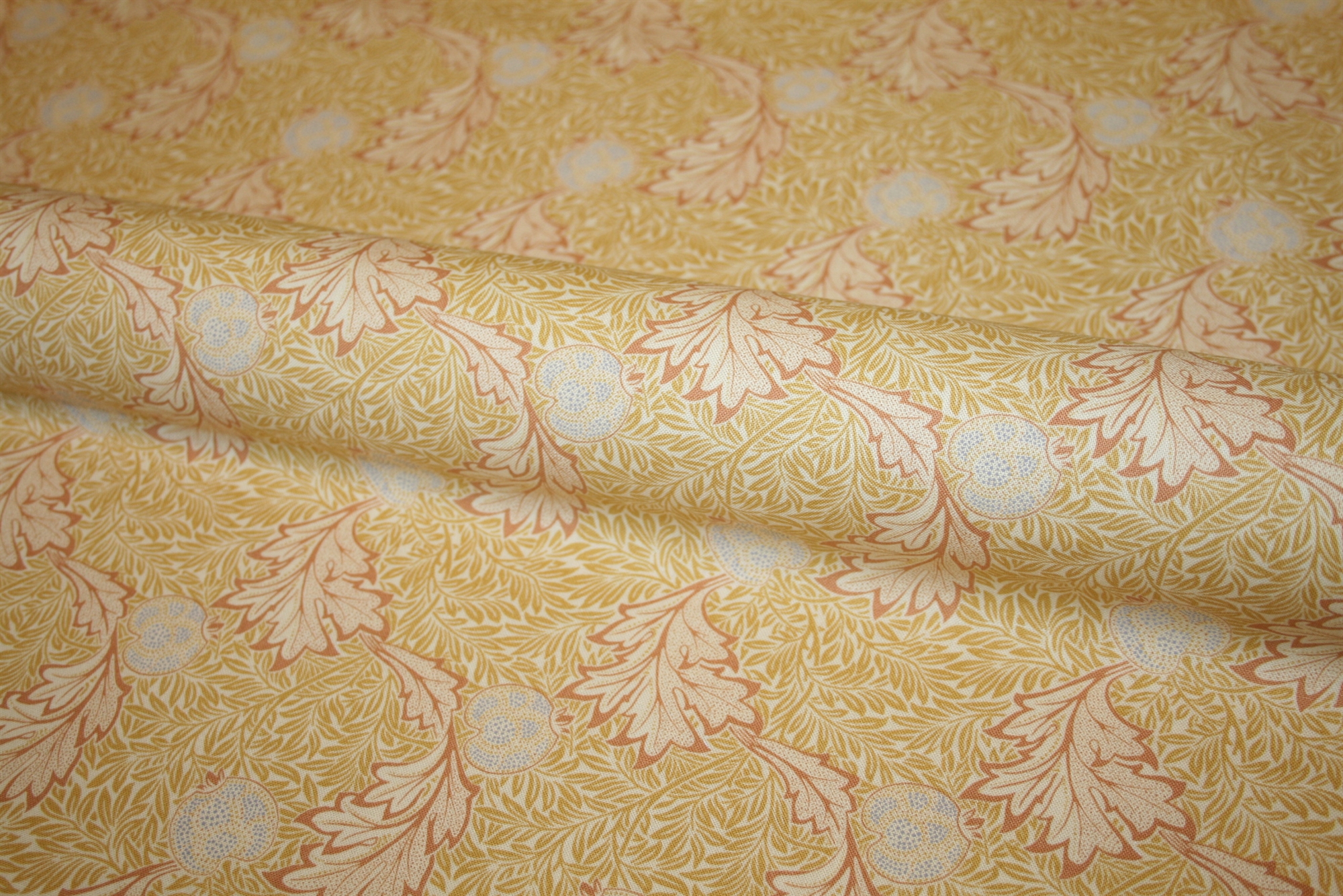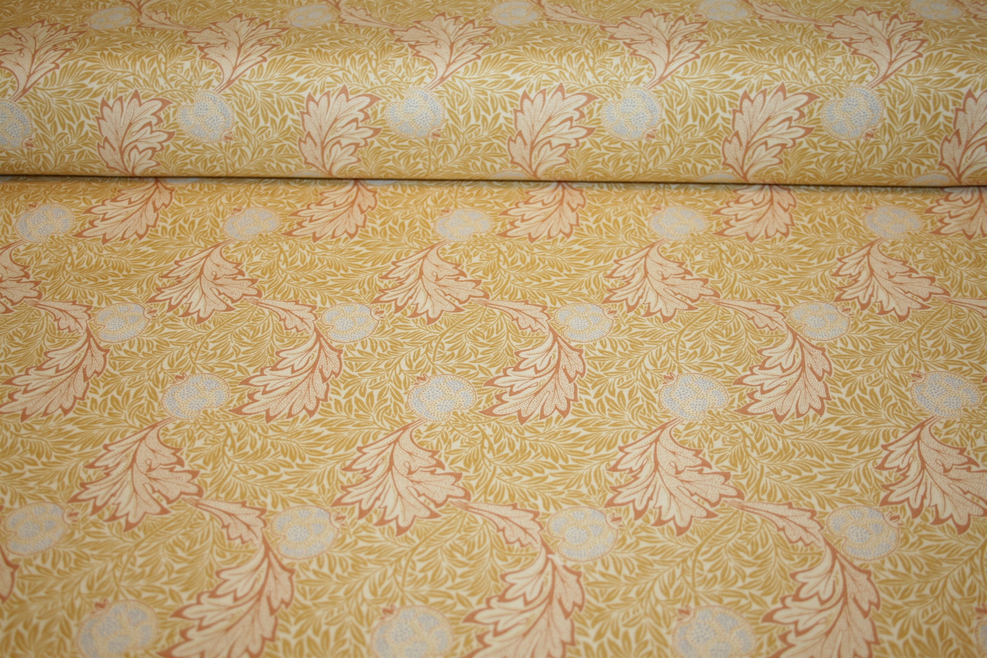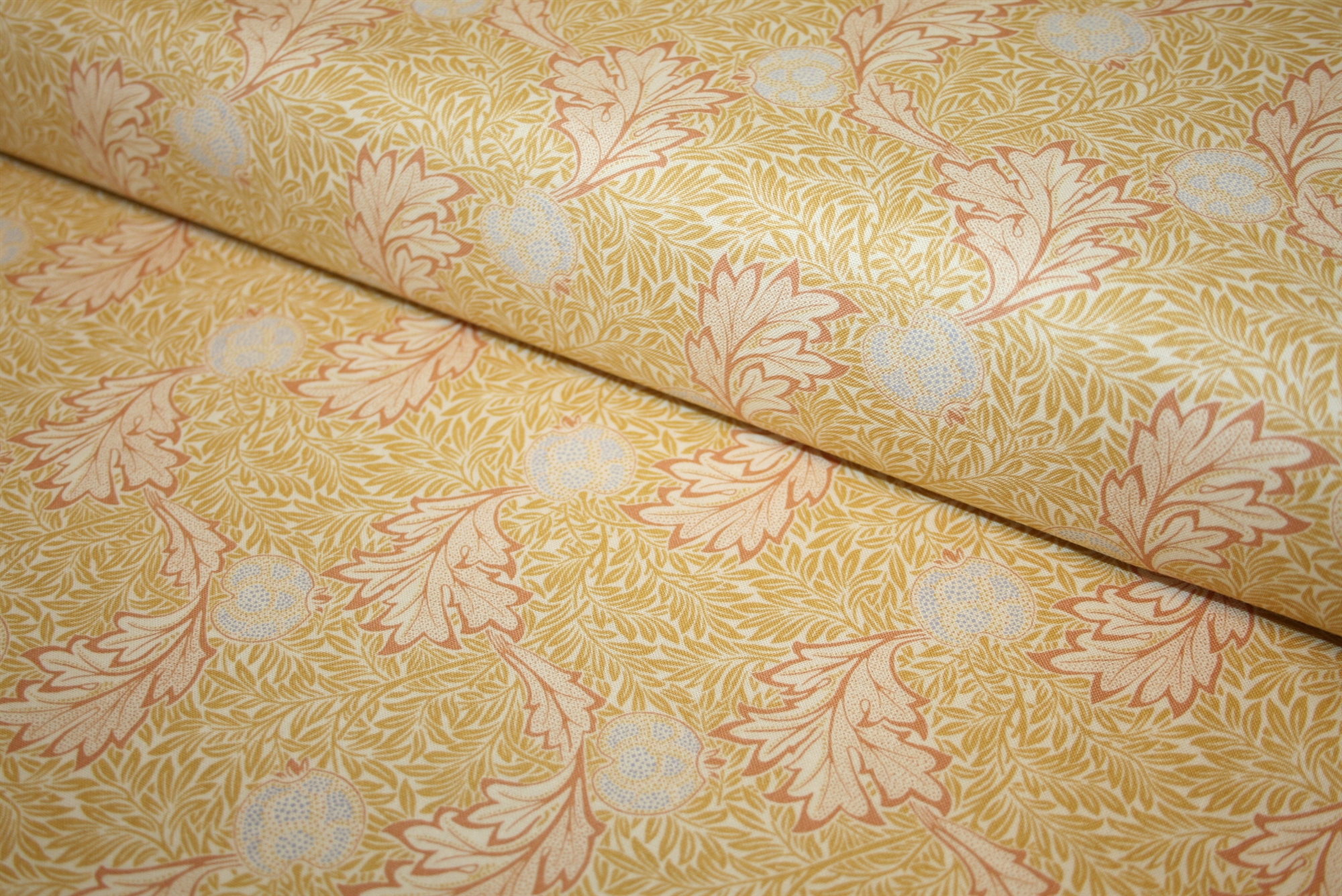 William Morris stof "Apple Gold" – snoede akantusblade og stiliserede frugter i gyldne nuancer på bomuld.William Morris stof "Apple Gold" – snoede akantusblade og stiliserede frugter i gyldne nuancer på bomuld.William Morris stof "Apple Gold" – snoede akantusblade og stiliserede frugter i gyldne nuancer på bomuld.William Morris stof "Apple Gold" – snoede akantusblade og stiliserede frugter i gyldne nuancer på bomuld.