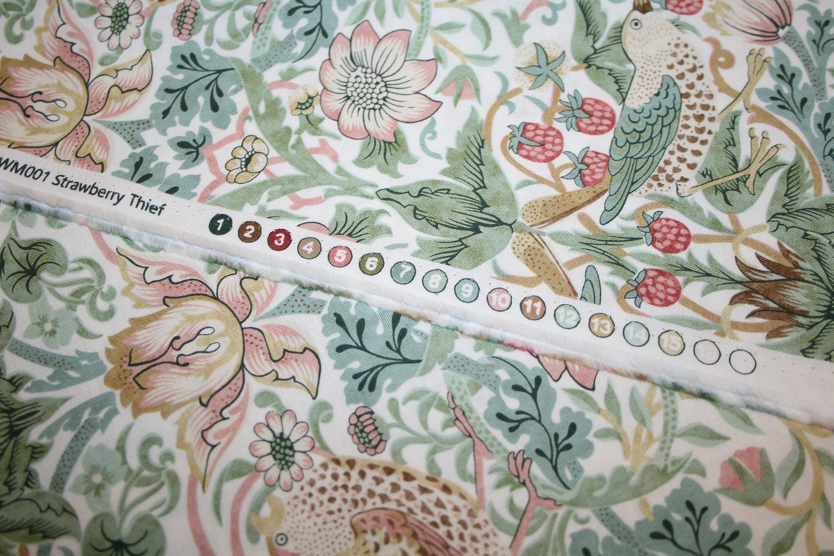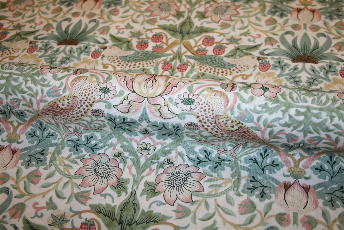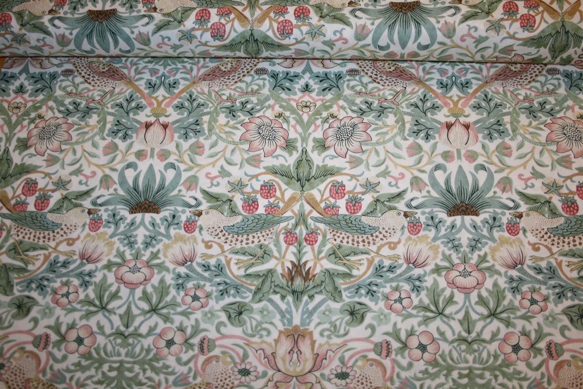 100% bomuld med ikonisk print af jordbær-stjælende fugle designet af William Morris. Kvaliteten er fastvævet og medium kraftig.