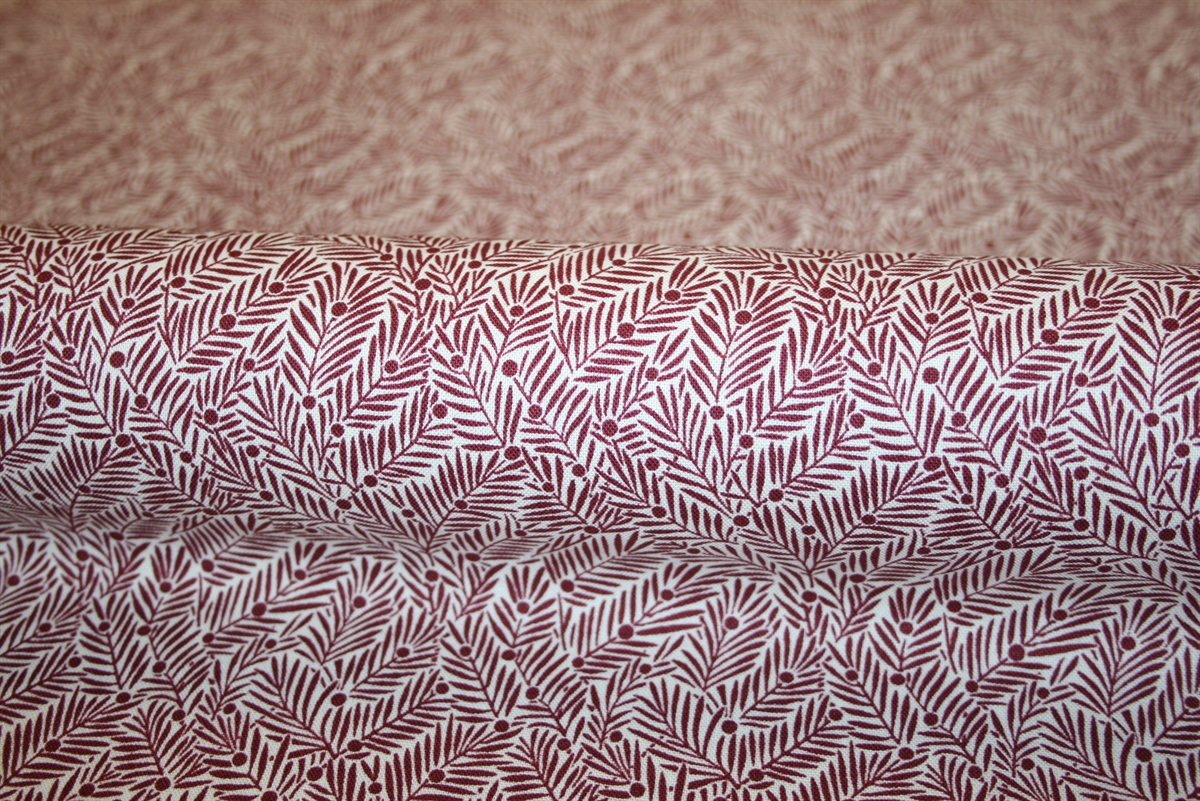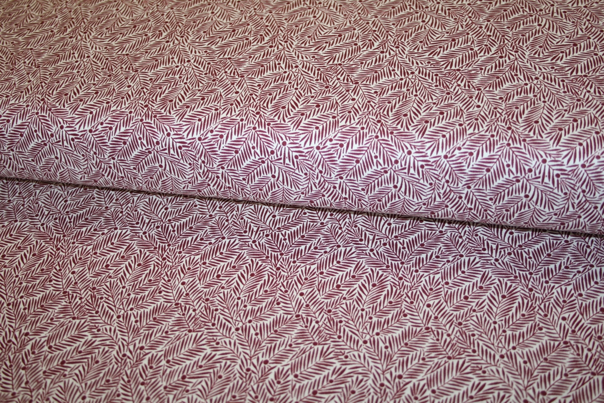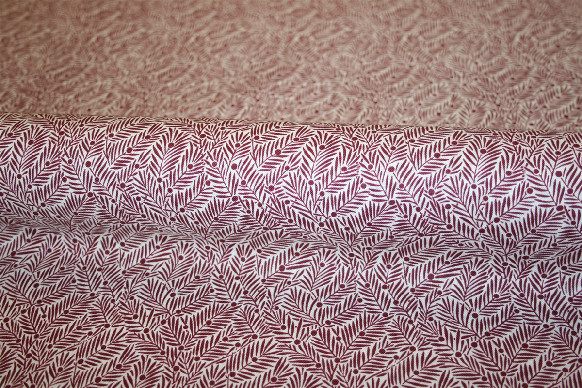 100 % bomuldsstof der kombinerer kvalitet og tradition i et tidløst mønster af bær og taksgrene i en varm og dyb bærfarve. Printet fremstår let og livligt med fine botaniske detaljer i bordeaux og offwhite, hvilket skaber et naturligt flow i mønstret. Den tætvævede bomuld gør stoffet ideelt til både patchwork, boligtekstiler og beklædning – med en struktur, der både er blød og slidstærk.