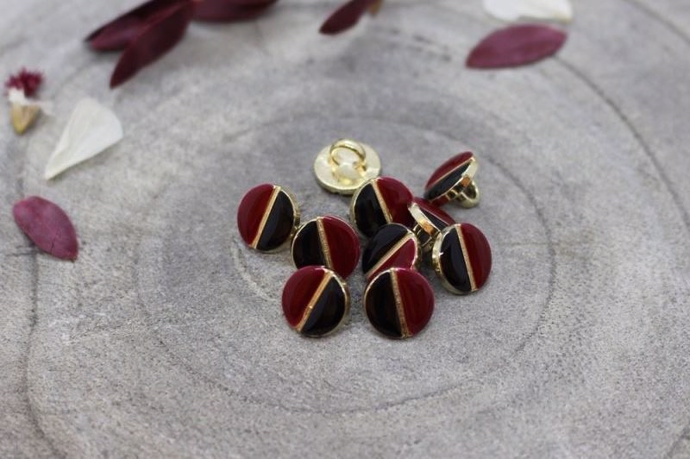 9 mm. sort/vinrød øjeknap i guldramme (Oeko-tex certificeret).