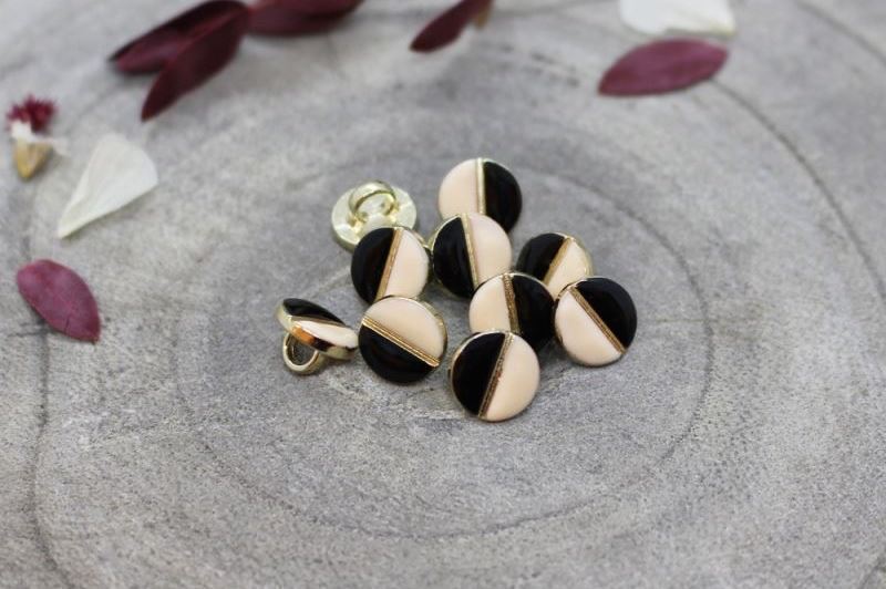 9 mm. sort/pudder øjeknap i guldramme (Oeko-tex certificeret).