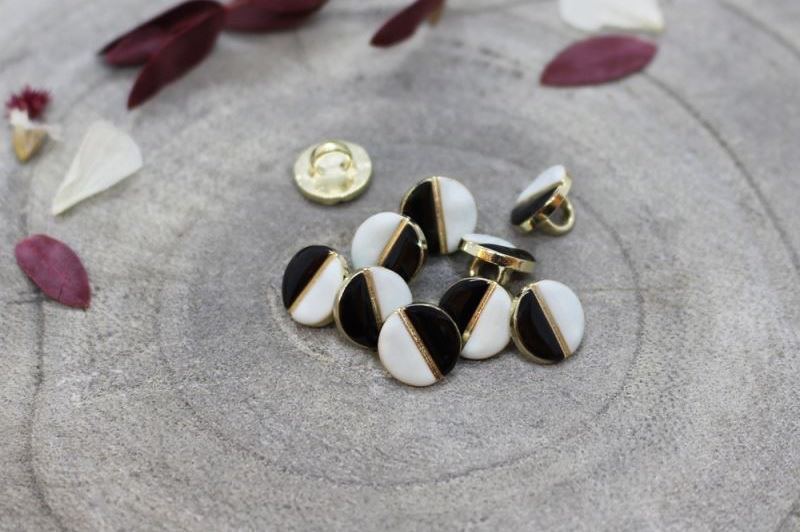 9 mm. offwhite/blåsort øjeknap i guldramme (Oeko-tex certificeret).