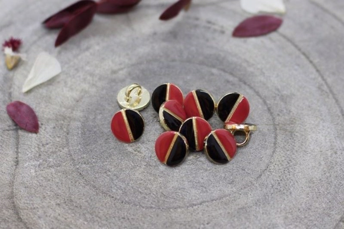 9 mm. sort/orangerød øjeknap i guldramme (Oeko-tex certificeret).