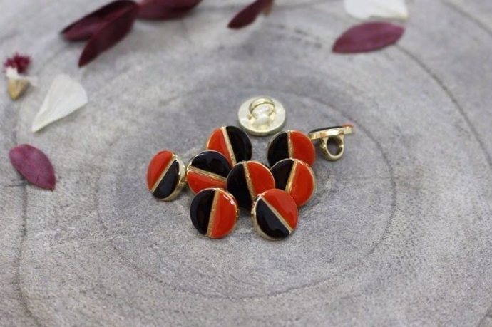 9 mm. sort/orangerød øjeknap i guldramme (Oeko-tex certificeret).