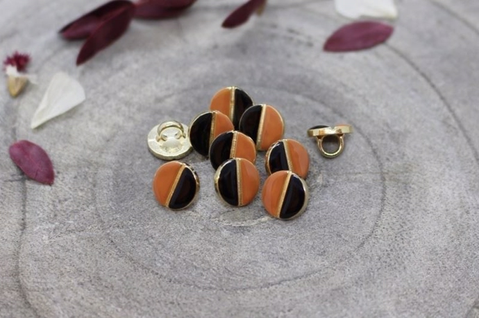 9 mm. sort/rødbrun øjeknap i guldramme (Oeko-tex certificeret).