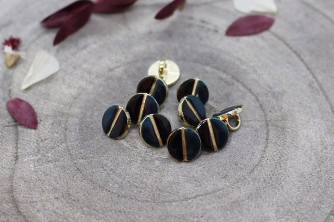 9 mm. sort/flaskegrøn øjeknap i guldramme (Oeko-tex certificeret).