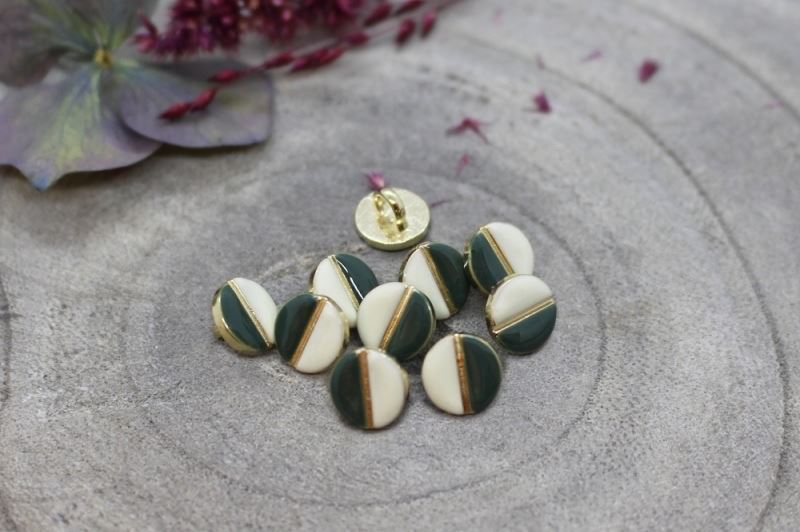 9 mm. offwhite/grøn øjeknap i guldramme (Oeko-tex certificeret).