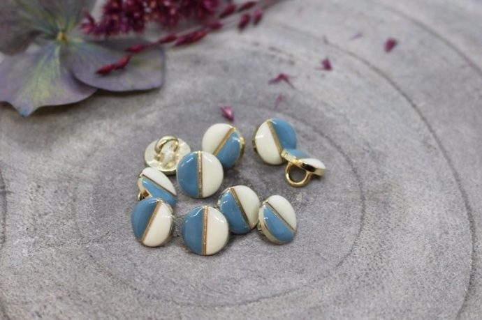 9 mm. offwhite/(due)blå øjeknap i guldramme (Oeko-tex certificeret).