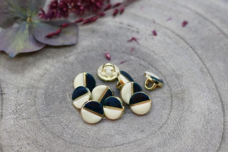 9 mm. offwhite/flaskegrøn øjeknap i guldramme (Oeko-tex certificeret).