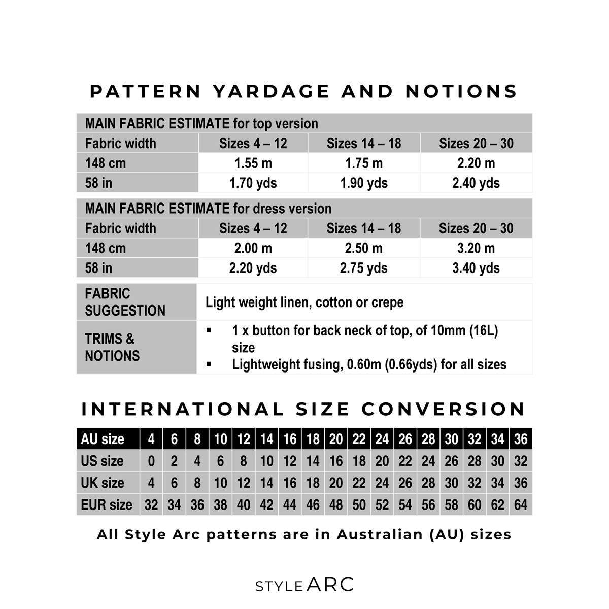 Modellen kan sys i et bredt udvalg af metervarer – fx bomuld, hør, viskose eller silke.